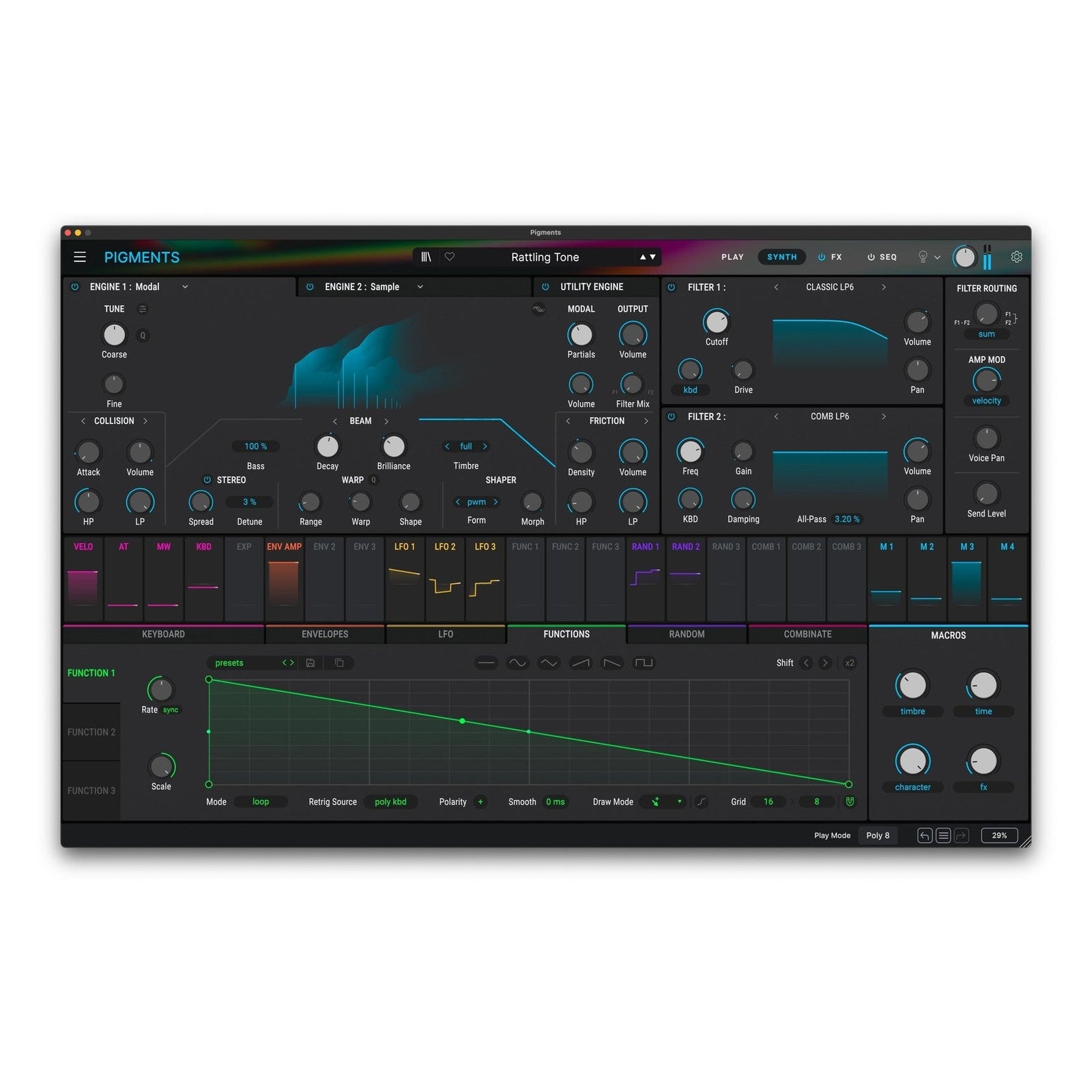 With Pigments, you’re not just choosing a synth — you’re opening up a studio-ready sound system that blends six advanced synthesis engines, a brilliantly visual interface and an inspiring library of presets. It delivers the versatility to build everything from aggressive trap bass hits and glitch-pop textures to smooth R&B pads and deep Afrobeat keys with authentic character and modern polish.