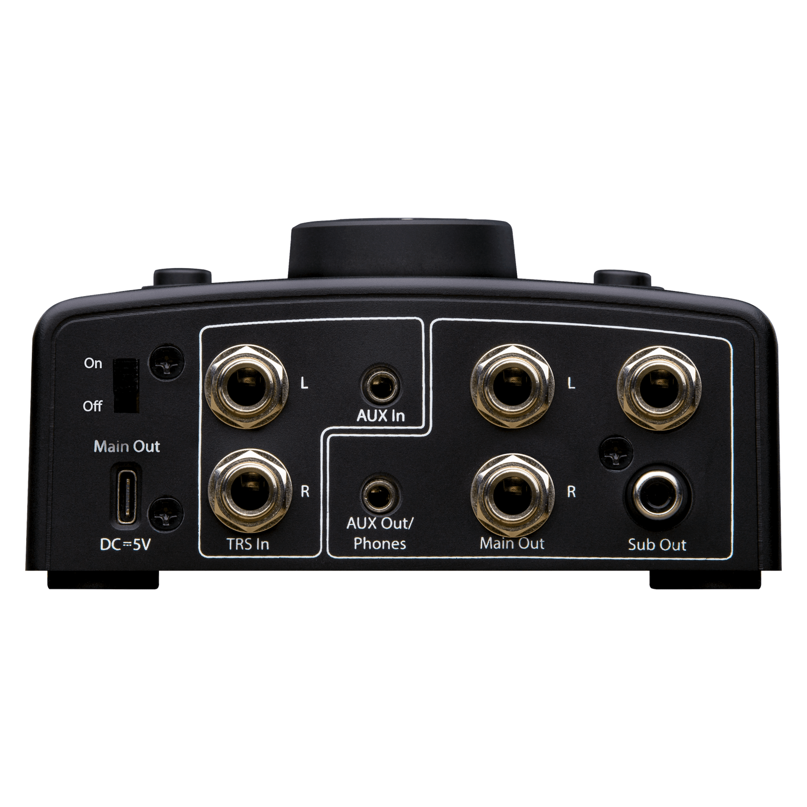 The unit provides balanced ¼″ TRS inputs for professional audio hardware (e.g. audio interfaces), plus a ⅛″ stereo input for consumer devices when you prefer wired connections. On the output side, you get balanced ¼″ L/R outputs for your monitors, a sub-out (¼″ TRS + RCA) for integrating a subwoofer, and a stereo ⅛″ headphone/aux output for private listening or monitoring. A large master volume knob controls both monitors and sub simultaneously, while dedicated buttons let you mute, bypass the sub, or switch input sources easily.