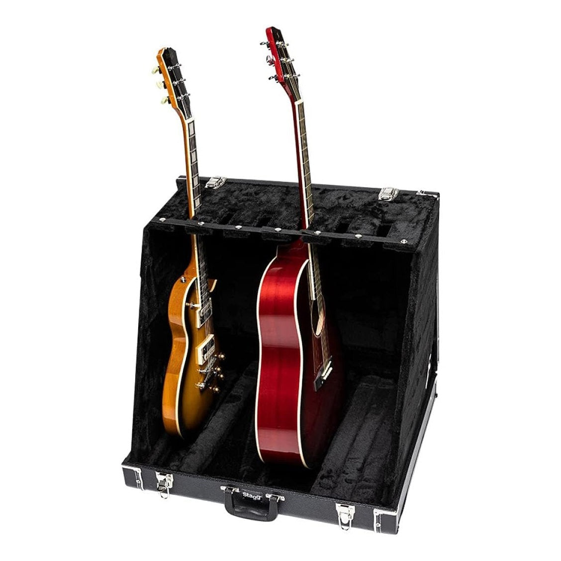 The Stagg GDC-6 Universal Guitar Stand Case offers a truly versatile solution for musicians needing to transport and display multiple instruments. This innovative product functions as both a durable hardshell case for secure travel and a convenient multi-guitar stand for stage or studio use. When closed, it presents as a traditional hardshell case, crafted from robust wood with a sleek black vinyl finish, ensuring superior protection against impacts and environmental elements.