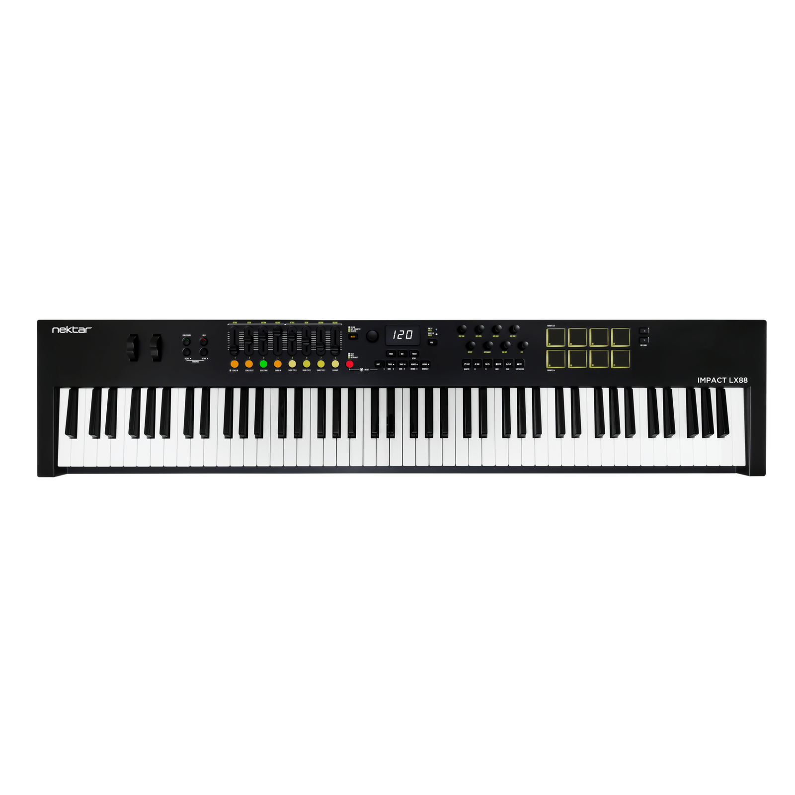 The Nektar Impact LX88 Mk3 combines a newly designed expressive keybed with powerful real-time controls. With 9 full-resolution encoders, 8 faders, 8 velocity-sensitive pads, and extensive DAW integration, this keyboard goes far beyond standard MIDI control.