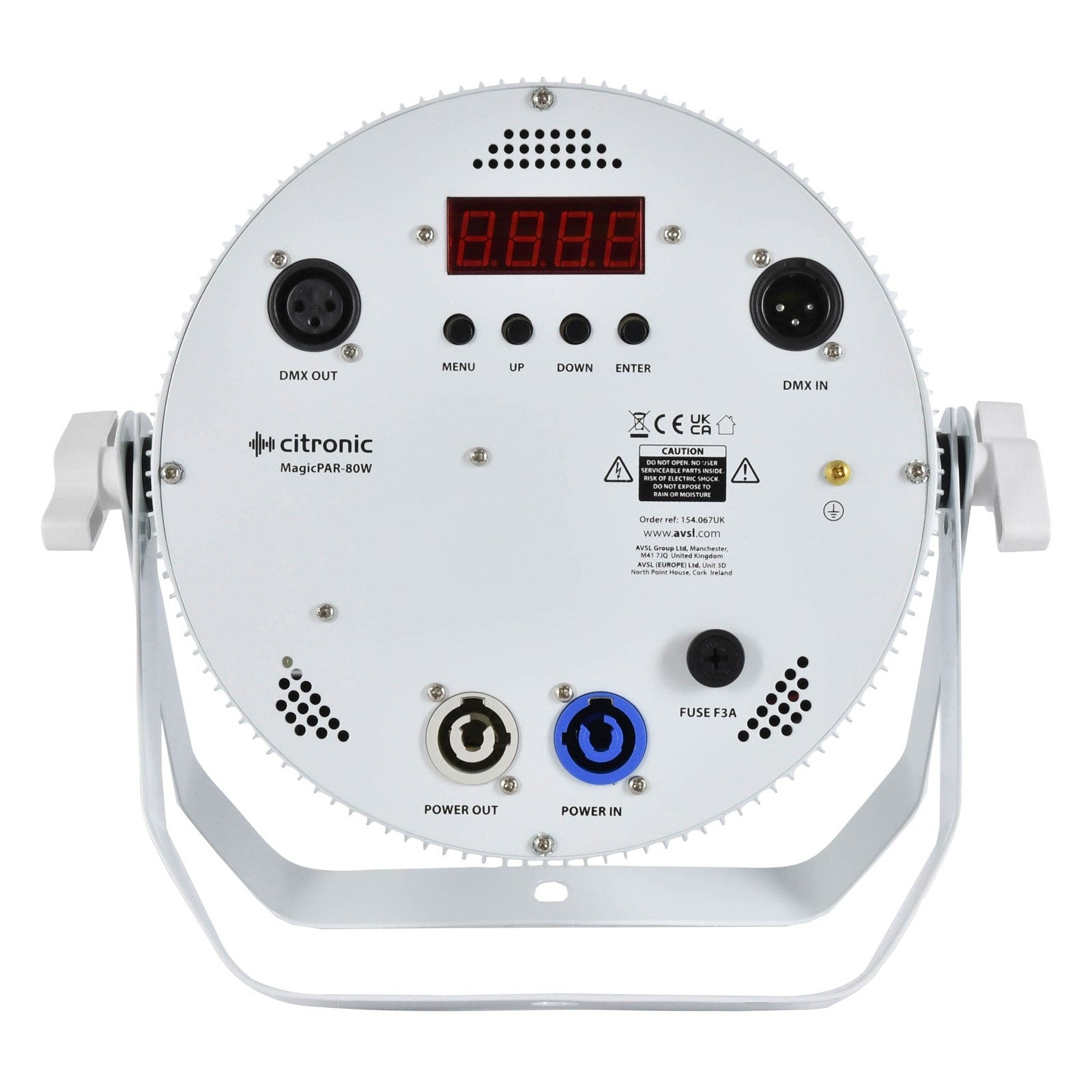 KEY FEATURES: MagicPAR-80 Fanless PAR Can with 12x12 RGBWA+UV LEDs (White)