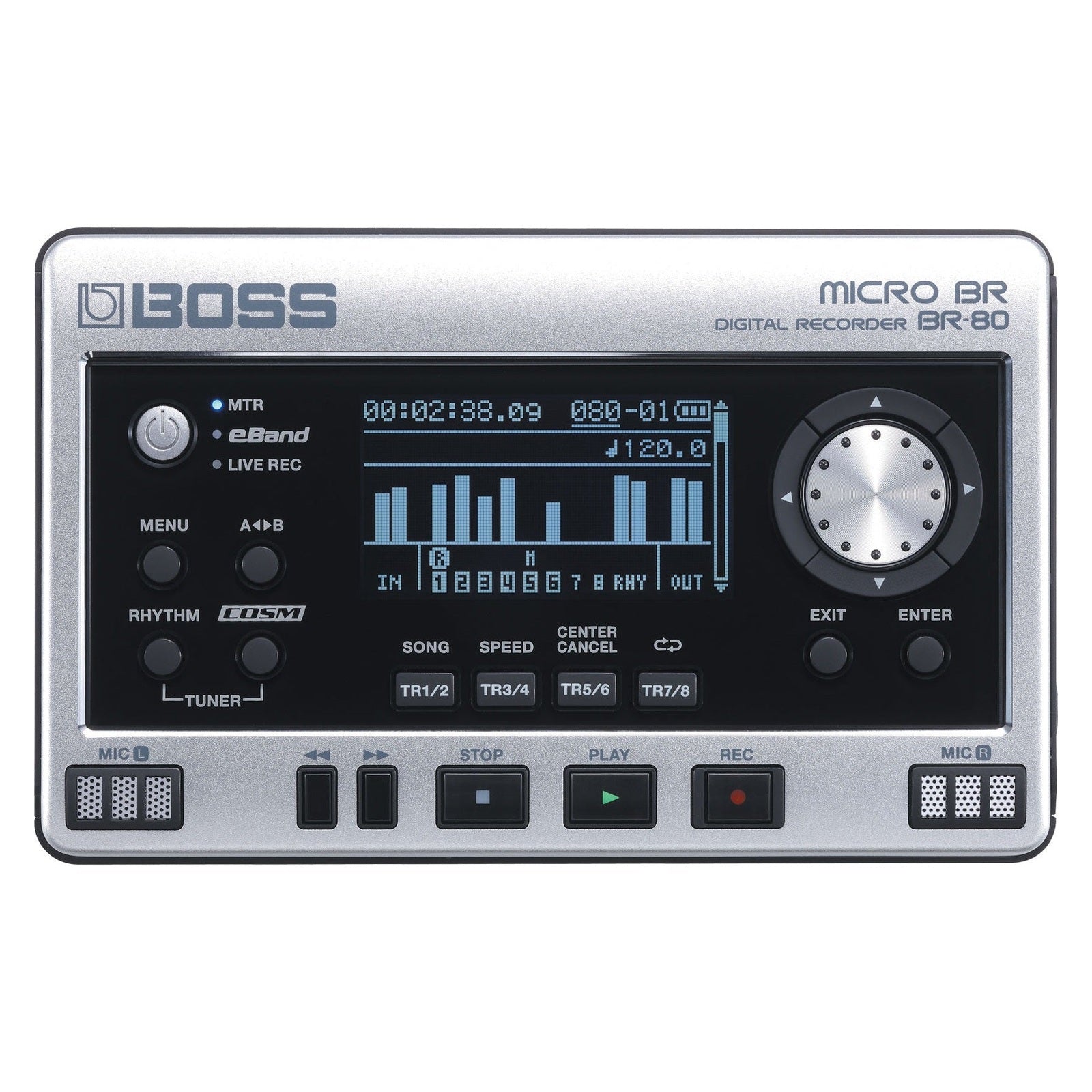 The BOSS Micro BR BR-80 is an ultra-portable digital recorder and pocket studio aimed primarily at guitarists and musicians. It uniquely combines three essential creative modes into one device: an 8-track Multi-Track Recorder (MTR) for full song creation, an eBand mode for phrase training and play-along practice, and a Live Rec mode for instant high-quality stereo capture. Despite its compact size, it is loaded with professional features including COSM amp modelling and multi-effects inherited from BOSS's acclaimed processors.