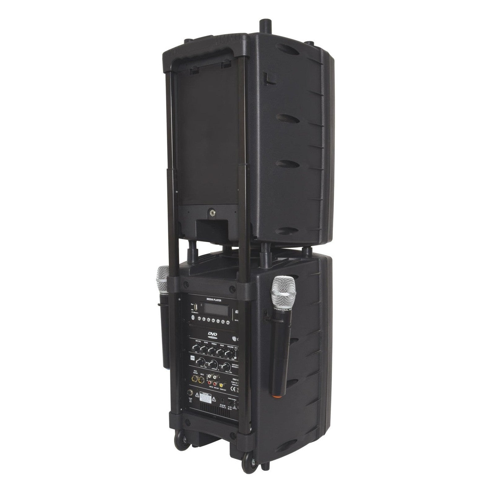 The main unit includes a versatile media player capable of playing audio from USB sticks, SD cards, Bluetooth devices, and a slot-loading CD/DVD drive. A pair of UHF wireless handheld microphones are supplied for speeches or performances, alongside 2 wired microphone inputs with echo effect and a VCV control to prioritise speech over music automatically.
