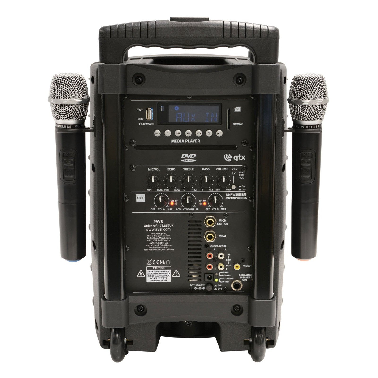 QTX PAV8 Portable PA System With 2 Wireless Microphones, Bluetooth & DVD/CD Player