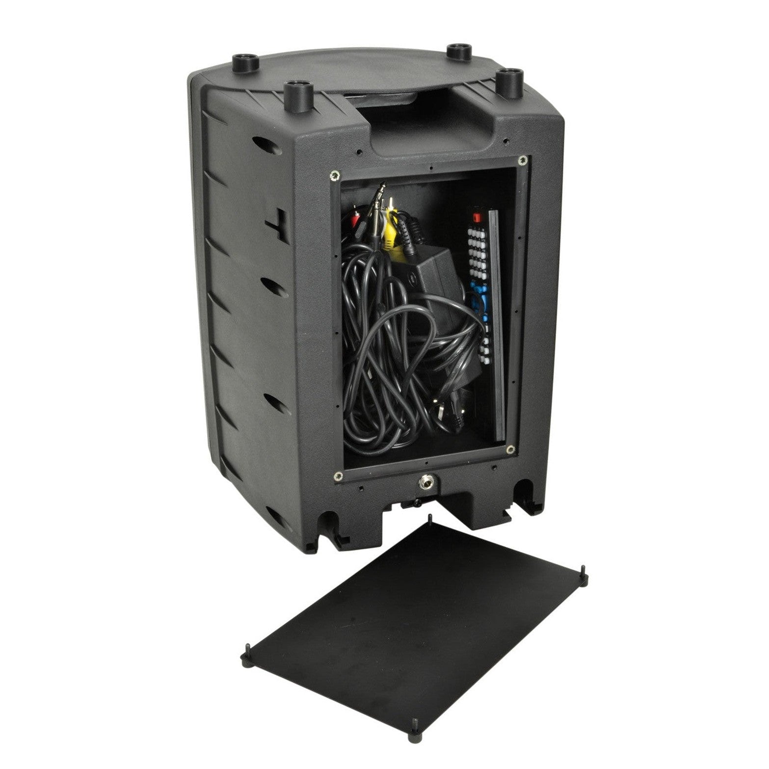 The main unit includes a versatile media player that supports playback from CD, DVD, USB, SD card, and Bluetooth devices, making it ideal for music, karaoke, and video playback. Two UHF wireless handheld microphones are supplied, with additional inputs for wired microphones and a built-in echo effect for singers. Mic priority can be enabled via the VCV function, automatically lowering music volume when speech or vocals are detected.