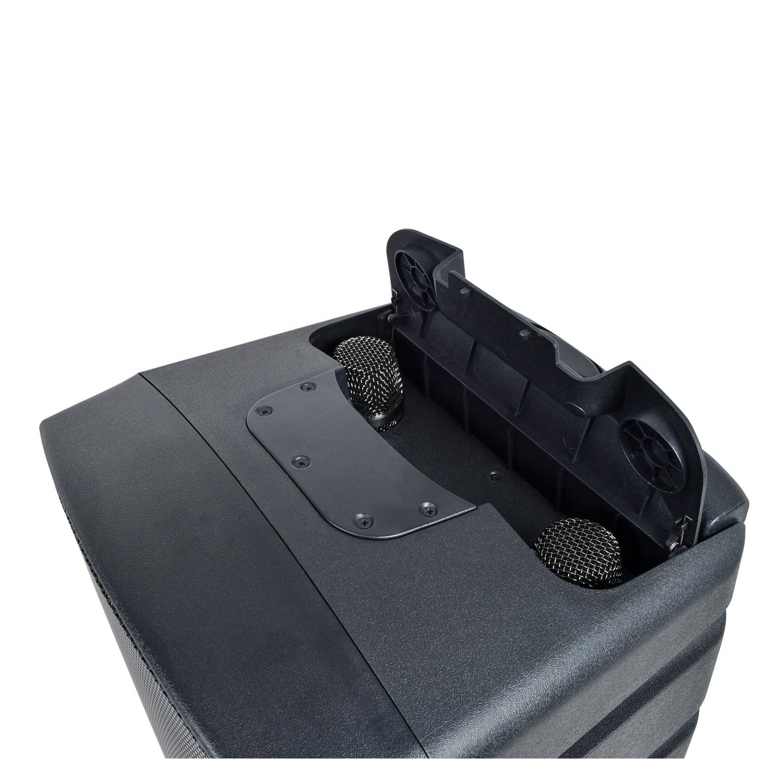 - Wireless Microphones: 2 x rechargeable UHF handheld microphones operating at 863.1–864.9MHz, stored in an integrated flip-top compartment.