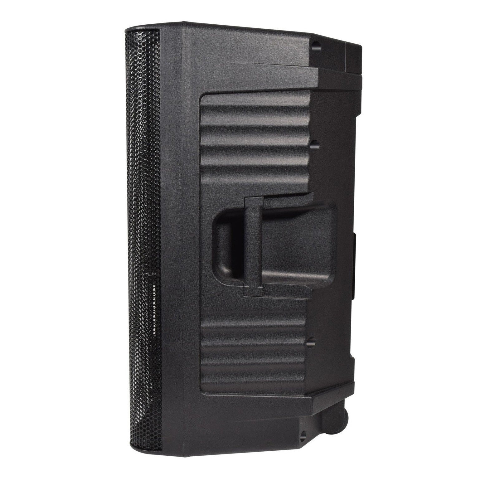 The QUEST-15 includes rear trolley wheels and multiple carrying handles for effortless movement. The 35mm pole mount socket allows for versatile stand mounting, enabling optimal positioning for stage or venue coverage. This makes it practical for touring musicians, mobile DJs, and event setups.